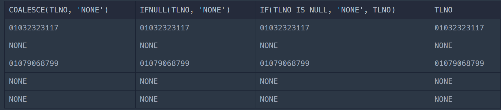SELECT COALESCE(TLNO, 'NONE'), IFNULL(TLNO, 'NONE'), IF(TLNO IS NULL, 'NONE', TLNO),