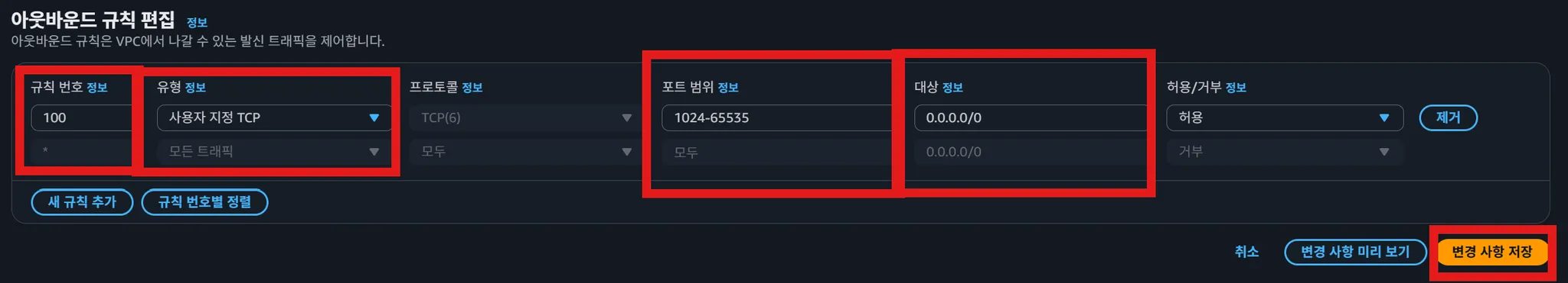 - 단 보통 아웃바운드의 포트가 1024~65535이므로 그렇게 설정함.