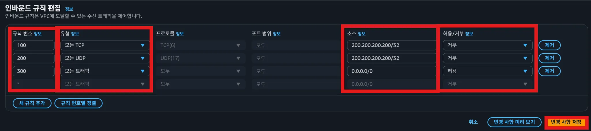 101번 규칙에 80포트를 허용하더라도, 100번 규칙으로 80포트를 막으면 80포트는 막힌다!