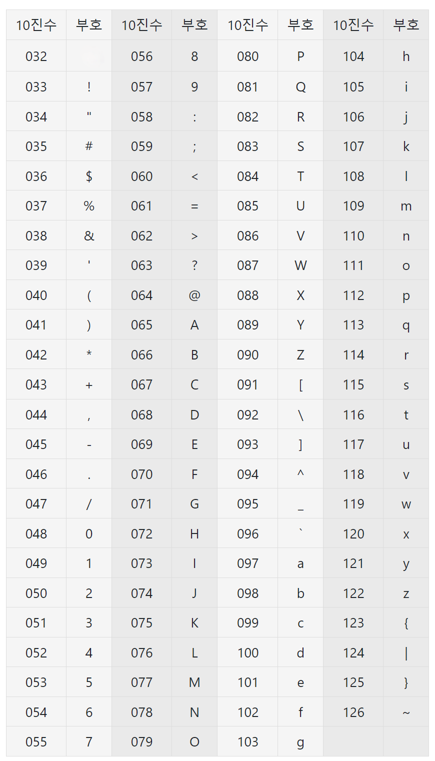 - 우리가 사용하는 대부분의 기호들이 할당되어 있음